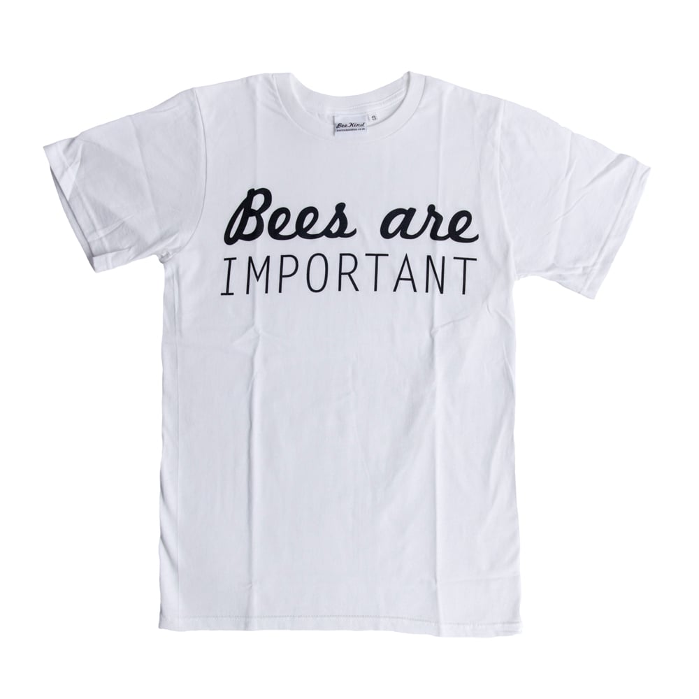 Bee Kind & Dine's debut "Bees are important" tee, made from 100% organic cotton. White with black print.